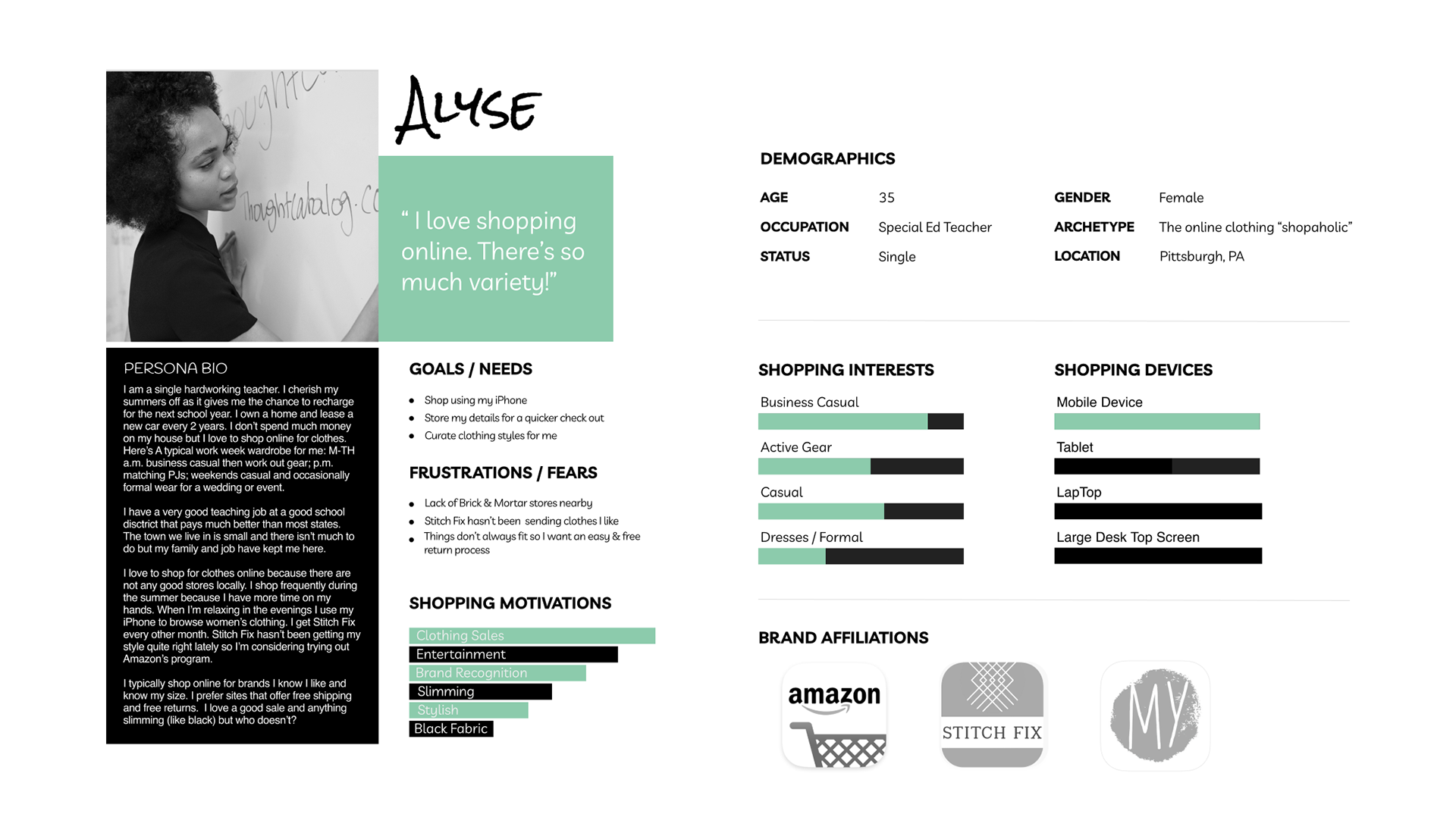 People who shop online for clothes are conditioned to industry standards and complete tasks quite quickly. The interviews and surveys revealed the primary persona to be female age 35 who loves to shop online and browses daily. She is a working woman with an active social life and enjoys the convenience of shopping online.