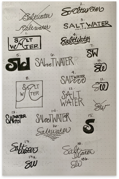 Before creating a high fidelity design, Saltwater’s rebrand needed to be flushed out. Based on the adjectives: modern, neutral, and fresh I began sketching logo ideas: